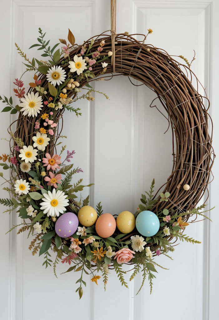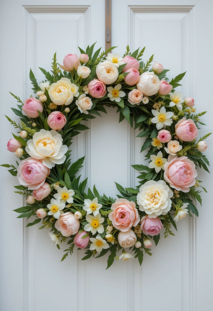 You can never go wrong with a floral wreath bursting with spring blooms. Think tulips, peonies, and daffodils in soft pastels or bold hues.