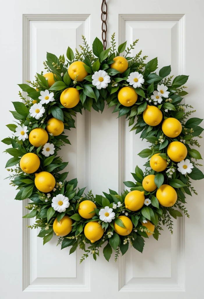 Add a zesty twist to your spring decor with a lemon-themed wreath! Faux lemons paired with greenery and white flowers create a fresh, Mediterranean-inspired look.