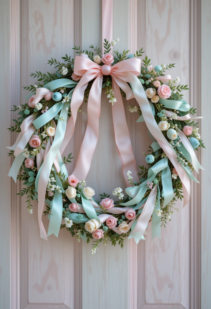 Nothing says “spring” quite like soft pastel tones. A ribbon wreath featuring pale pinks, baby blues, and mint greens adds a playful and delicate charm to your door.