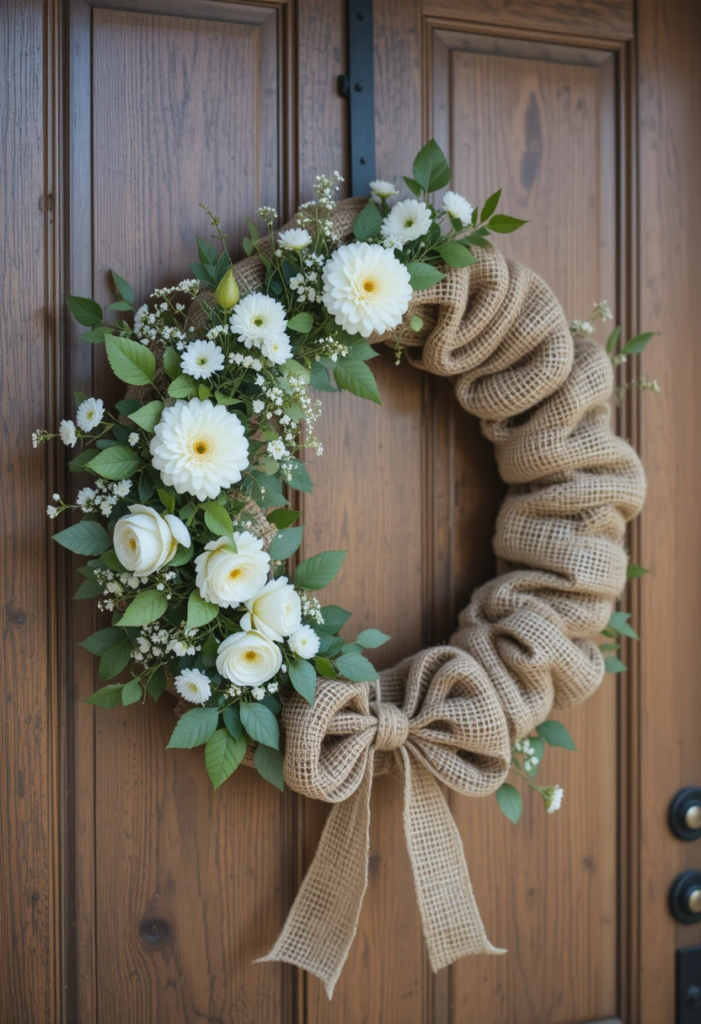For a cozy farmhouse feel, a burlap wreath with subtle floral accents is a great choice.