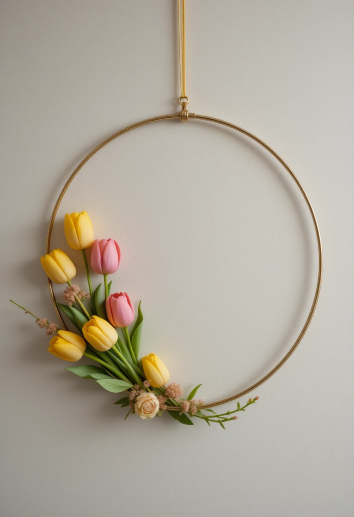 A modern and chic option, a tulip hoop wreath features a simple metal or wooden hoop adorned with vibrant tulips.