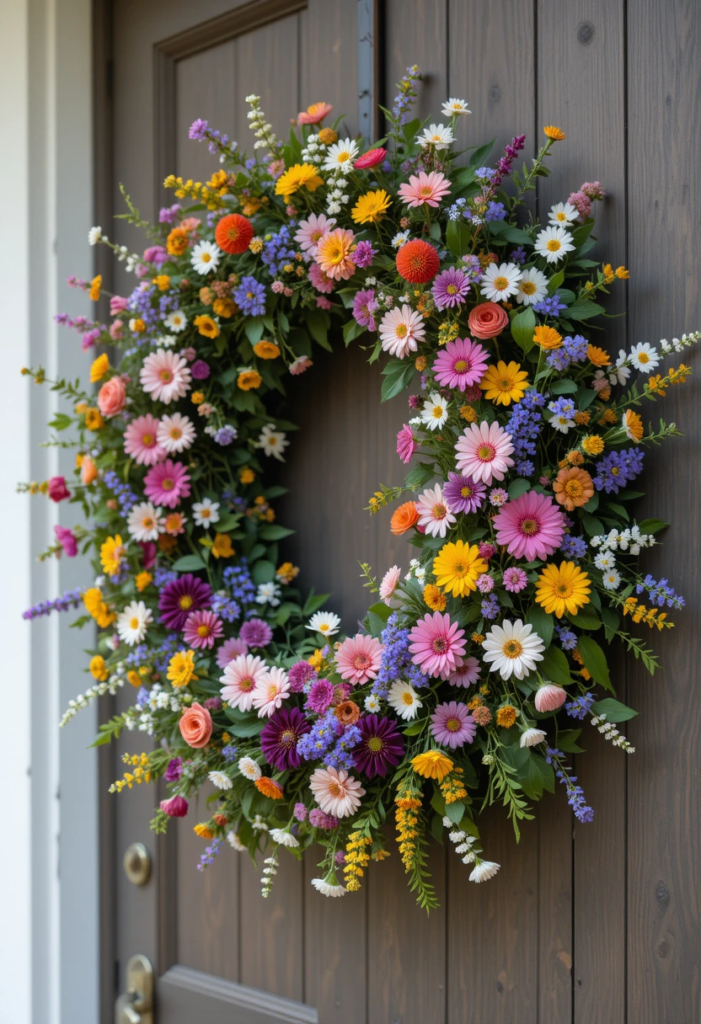 For a more natural and free-spirited vibe, a wildflower wreath is a perfect choice.