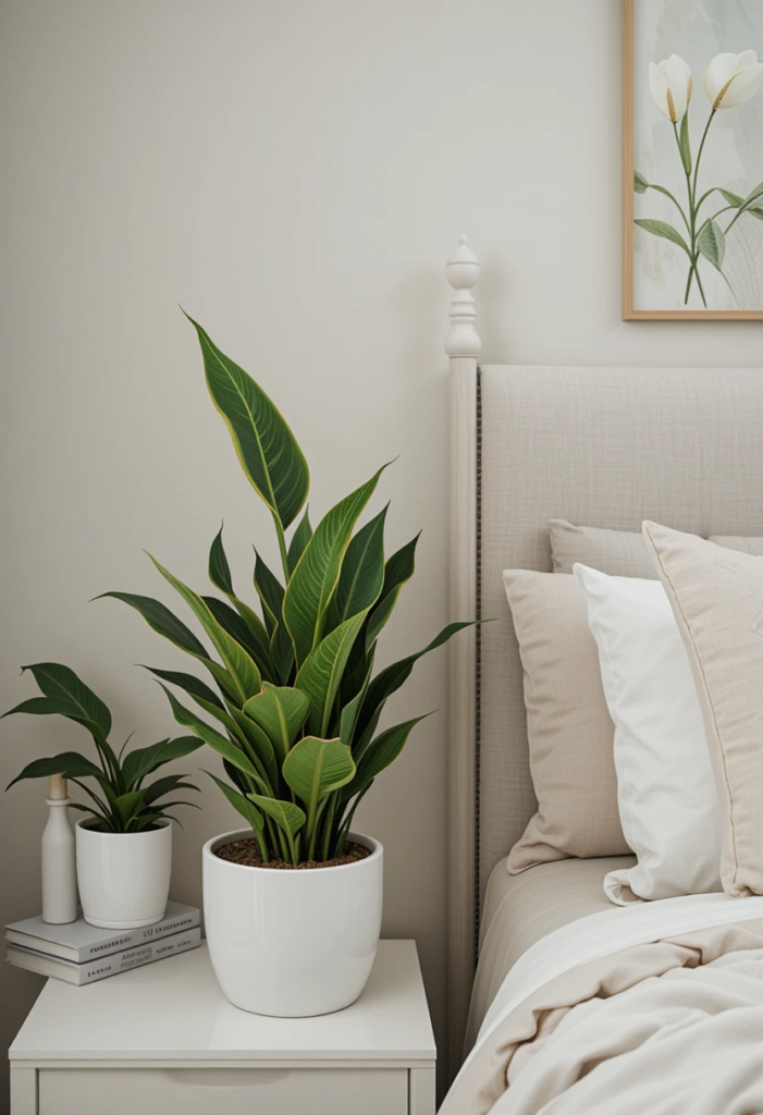 Neutral palettes are the perfect backdrop for a pop of green. Adding plants instantly makes a beige and white bedroom feel fresh and vibrant. Think potted snake plants, trailing ivy, or a peace lily on your nightstand.