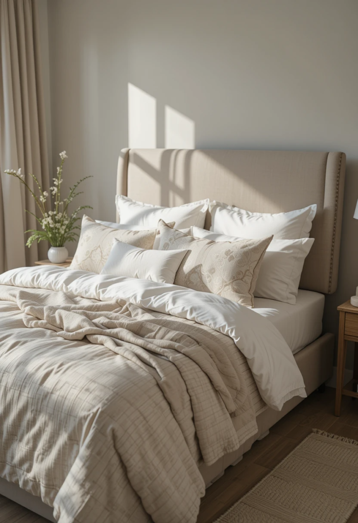 Quick idea: Start with white bedding, toss in a beige linen throw, and top it off with a few woven or textured cushions. Instant cozy.