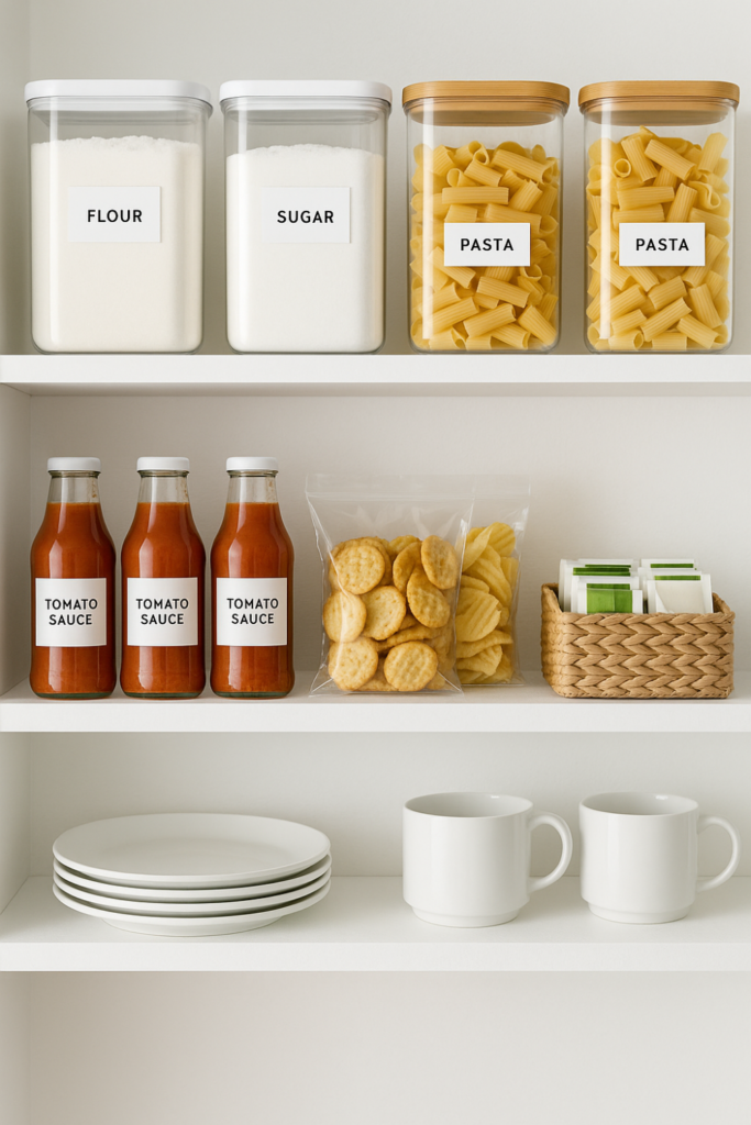 Organize your pantry by purpose: a baking section, a snack station, a cooking zone, and so on. Creating these zones saves time and makes it easy for the whole family to find what they need without rummaging.