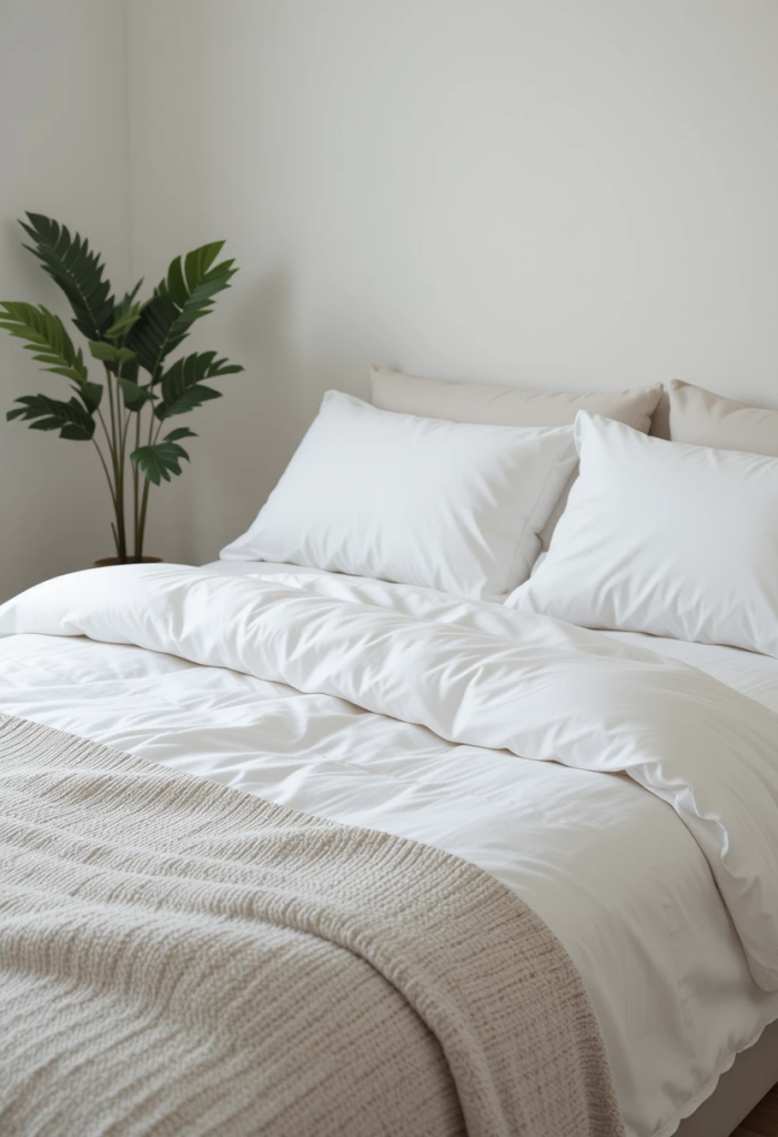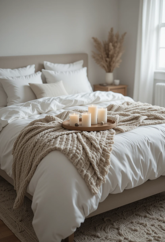 Not into stark white everything? That’s okay—layering warm neutrals can actually make a space feel more inviting. Add textures like a chunky knit throw or a linen duvet to bring softness without adding visual clutter.