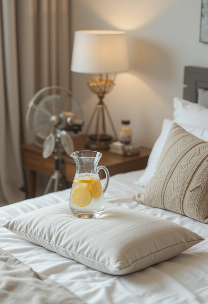 Let’s face it—summer gets hot. Place a cute fan on your nightstand, keep a carafe of water within reach, or try a cooling gel pillow. These touches are both practical and pretty.