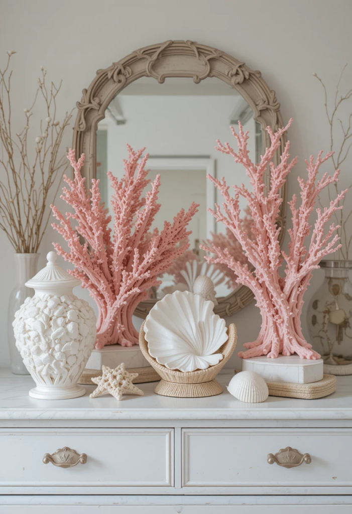Don’t forget the small touches! Pink coral pieces, shell bowls, or decorative trays add texture and that breezy beach house feel. Display them on your dresser, bookshelf, or nightstand for a subtle coastal touch.