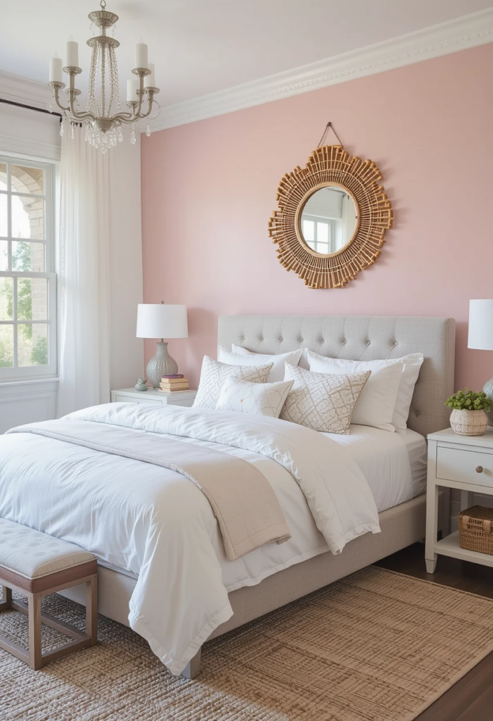 Want to make a big impact with minimal effort? Try painting just one wall in a soft pink shade. It adds warmth and charm without overpowering the room. Bonus points if you decorate that wall with beachy elements like rattan mirrors or framed ocean art.