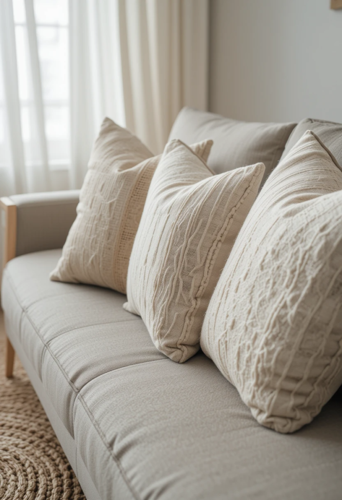 Opt for natural materials like linen, cotton, and jute. Think woven baskets for storage, light linen throws on the couch, and sheer curtains that allow natural light to filter in.