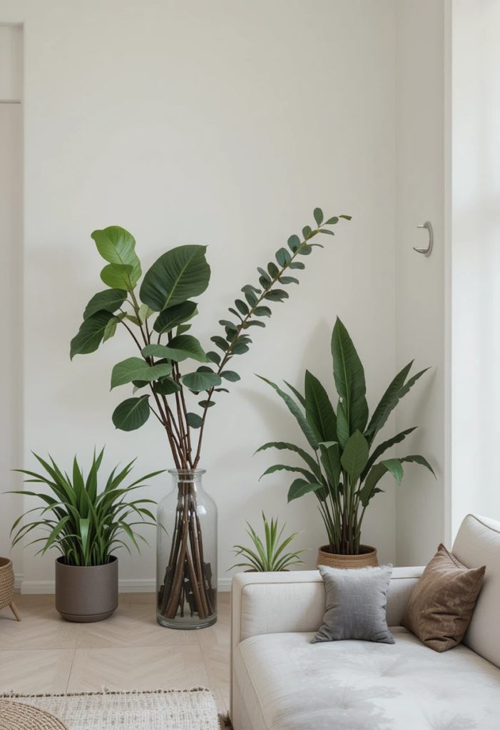 Choose simple potted plants or cuttings like eucalyptus stems that don’t require much maintenance.