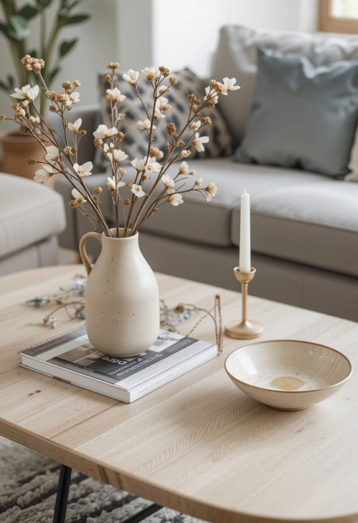 A simple ceramic vase, a sculptural candle holder, or a textured bowl can make a beautiful impact without feeling too busy.
