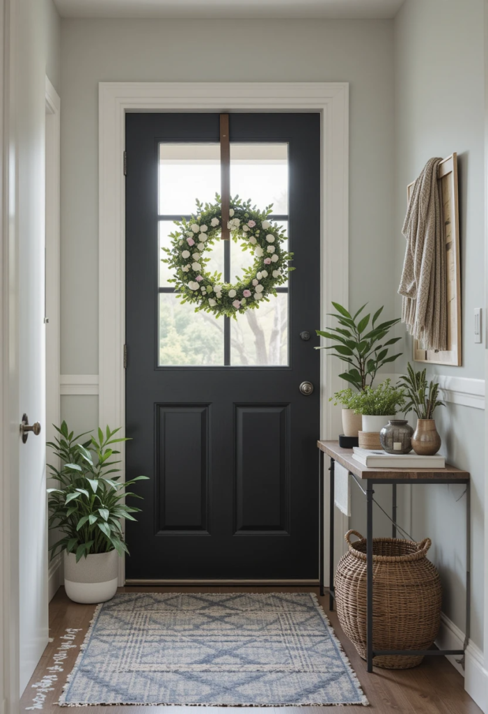 Woven baskets or minimalist storage options can help keep the area tidy, and adding a few plants can make the space feel more inviting without cluttering it.