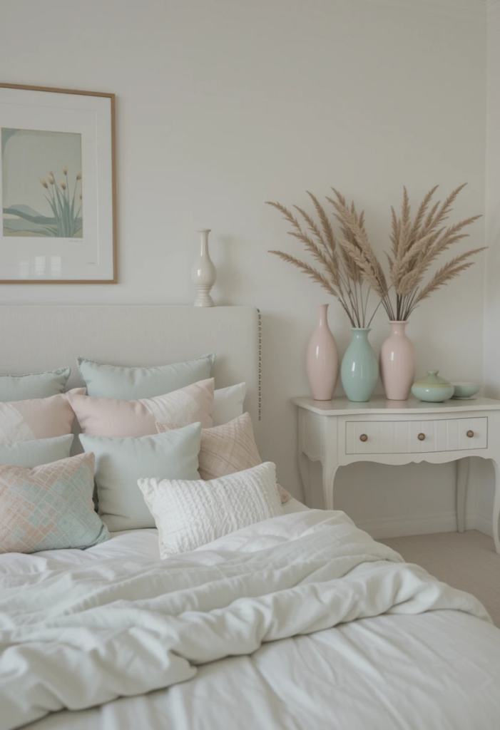 Opt for pastel hues like soft blues, blush pinks, and light greens. These colors can easily be incorporated through throw pillows, vases, or artwork.