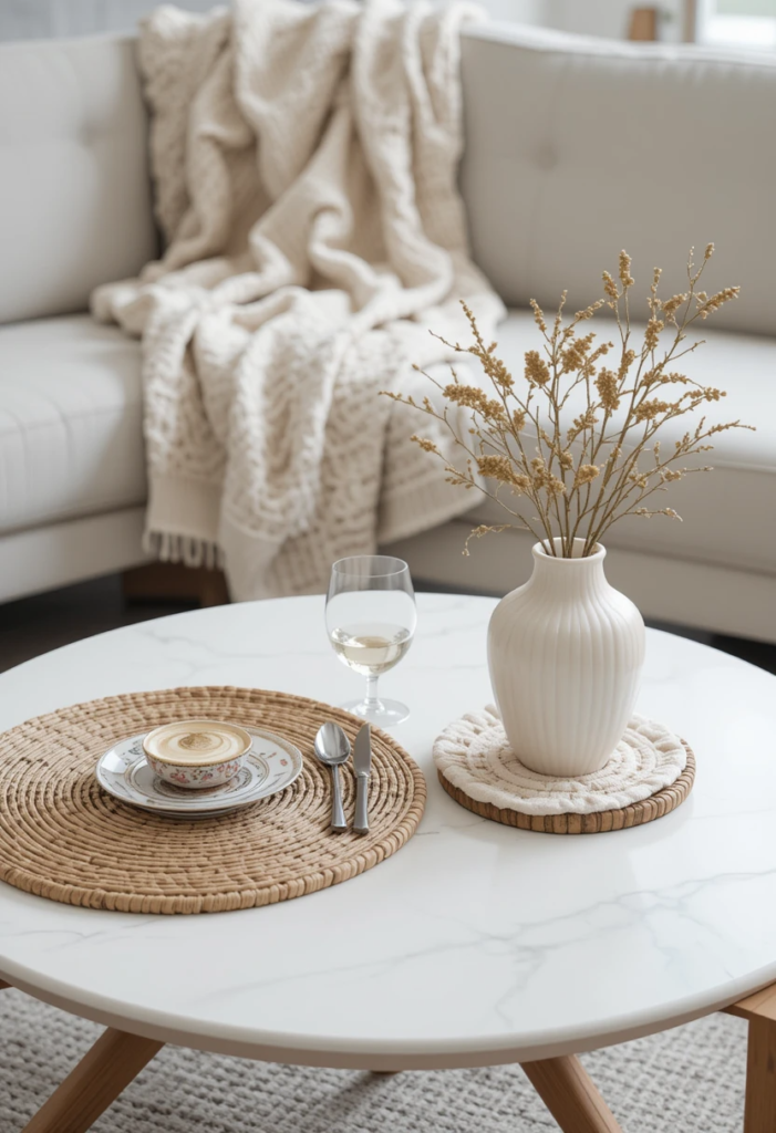 Mixing different textures adds depth and interest to your coffee table. Try combining a woven basket, a linen coaster, or a ceramic vase.