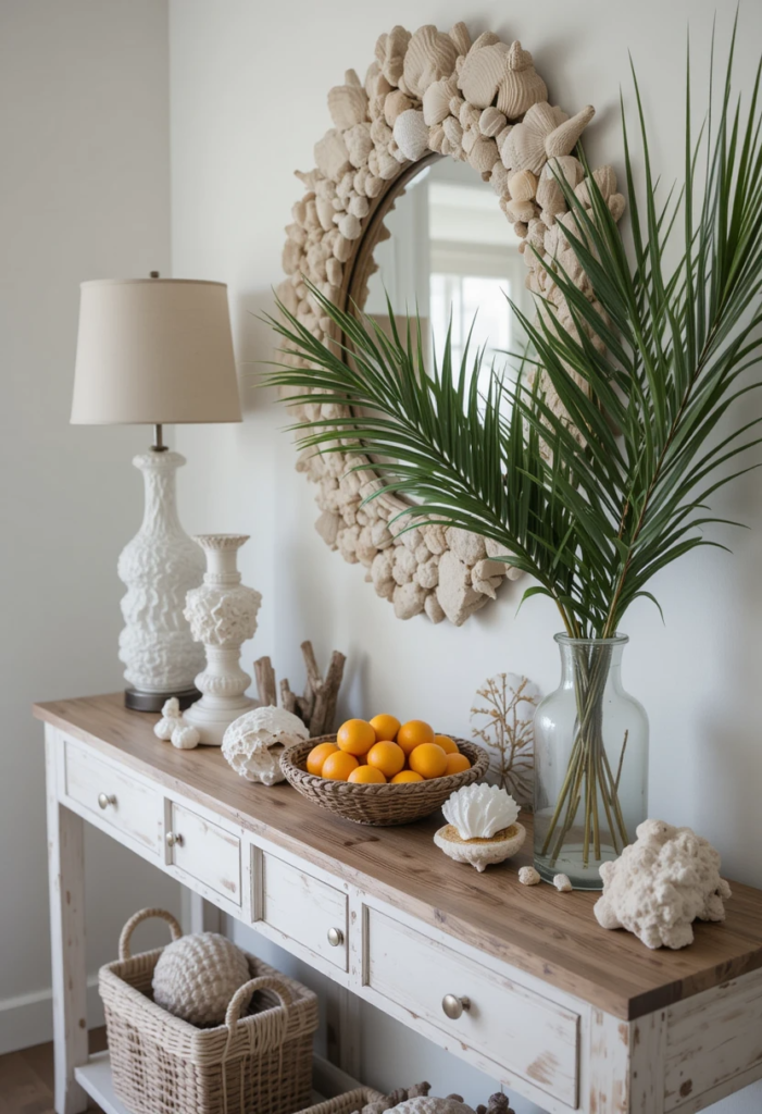 It’s the little things that tie it all together. Bring in seashells, coral, driftwood, or even tropical fruits as centerpieces. Think pineapples, coconuts, or citrus bowls on display.