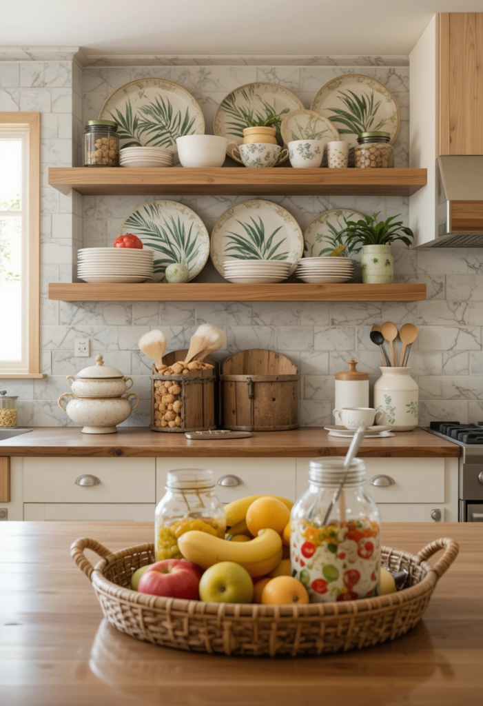 Display colorful mugs or patterned plates on open shelves for a fun yet chic pop. Even a simple bowl of limes or lemons can double as stylish and practical decor.