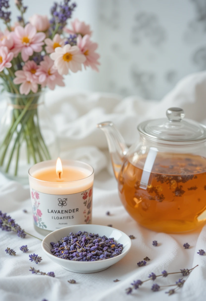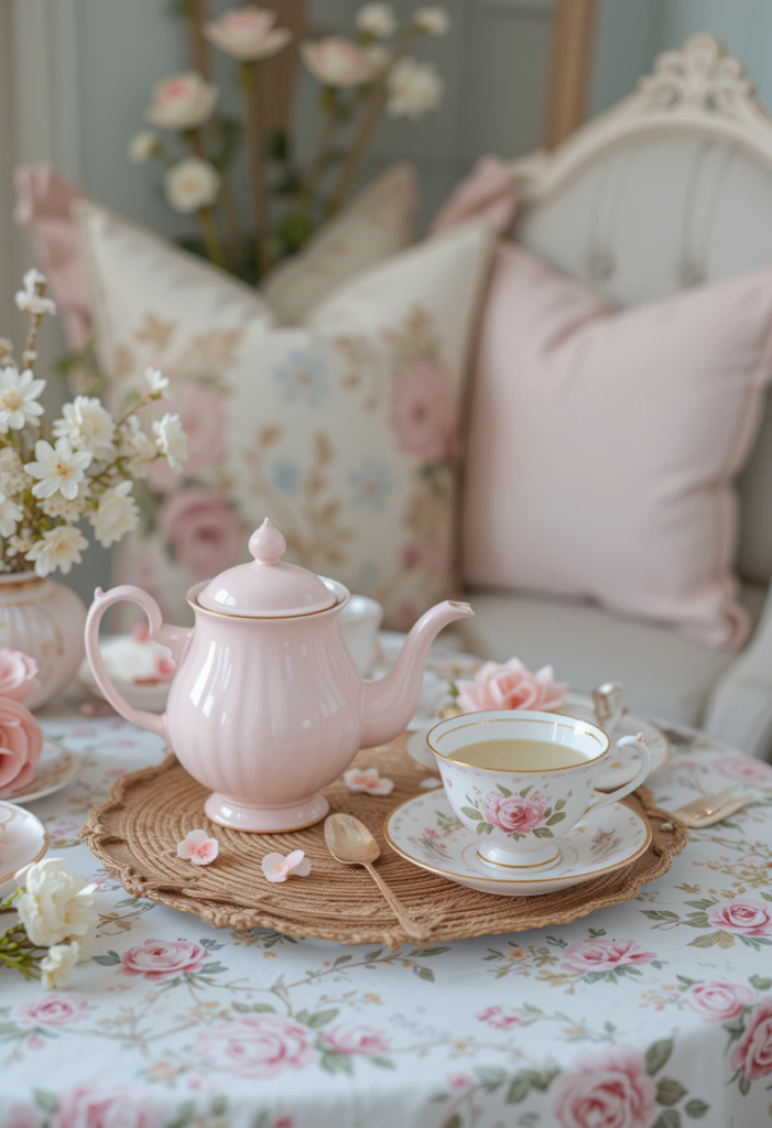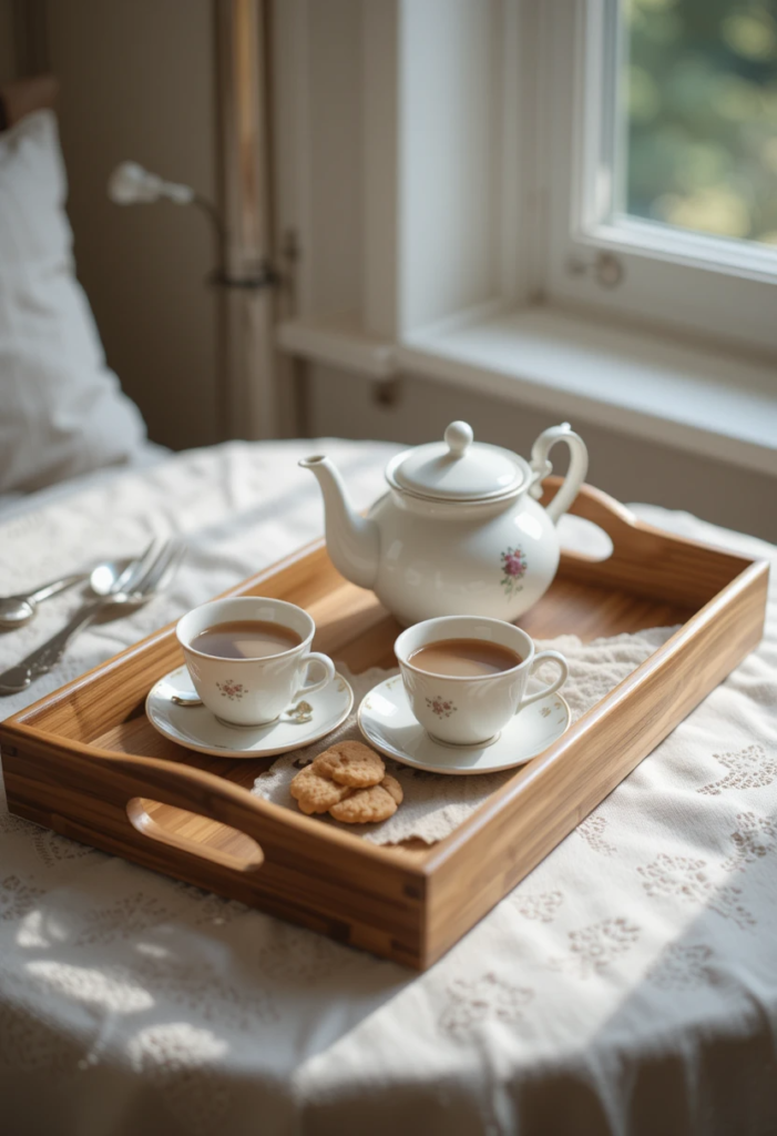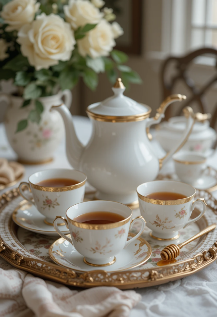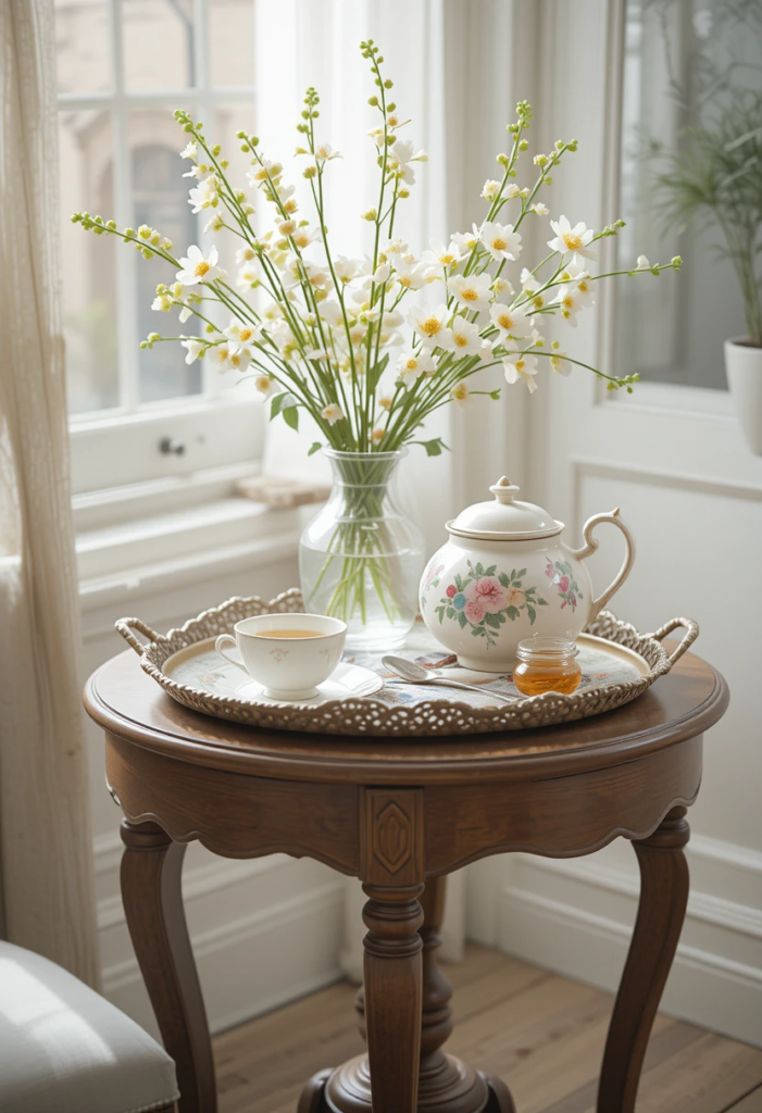 Elegant tea accessories – Displaying a beautiful teapot, delicate teacups, and a stylish tray can make the setup feel extra special.