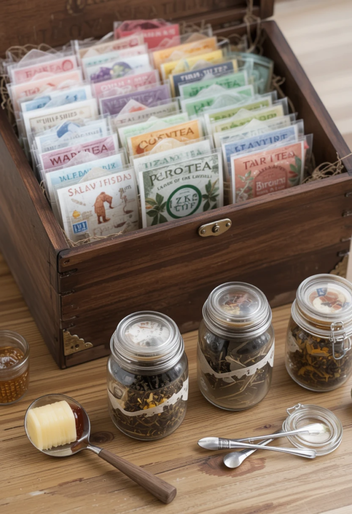 A small tea storage solution – Keep your favorite teas organized in a pretty box or jars for easy access.