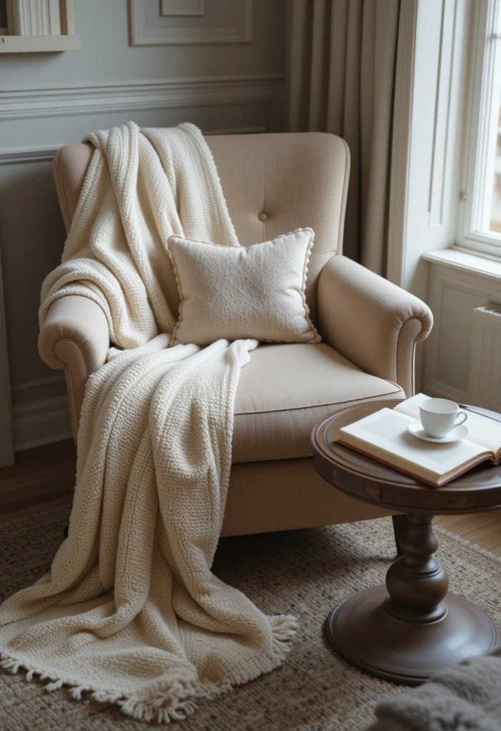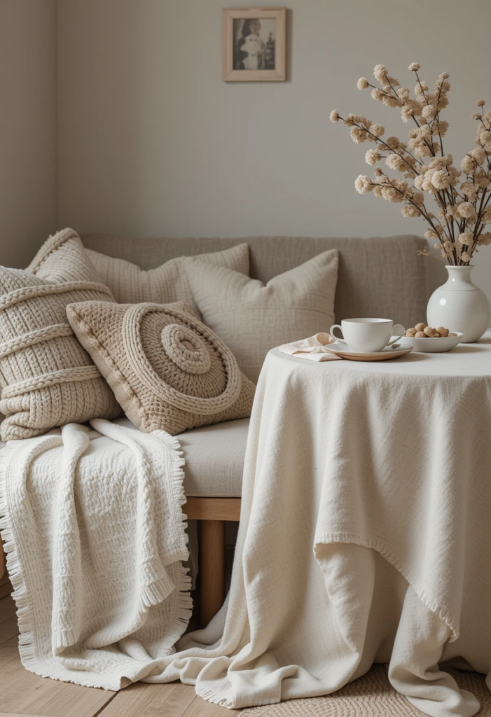 Layer in soft textures – Add a throw blanket, some plush cushions, or a linen tablecloth for a relaxed and inviting feel.