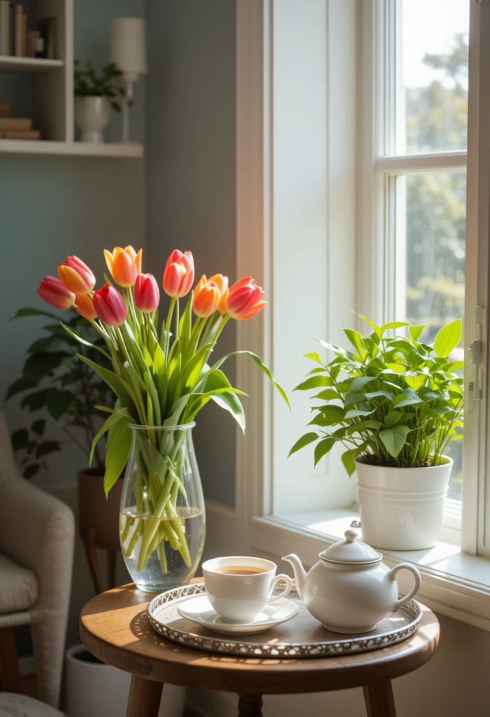 Fresh flowers or greenery – A small vase with tulips, daisies, or eucalyptus can instantly brighten up the space.