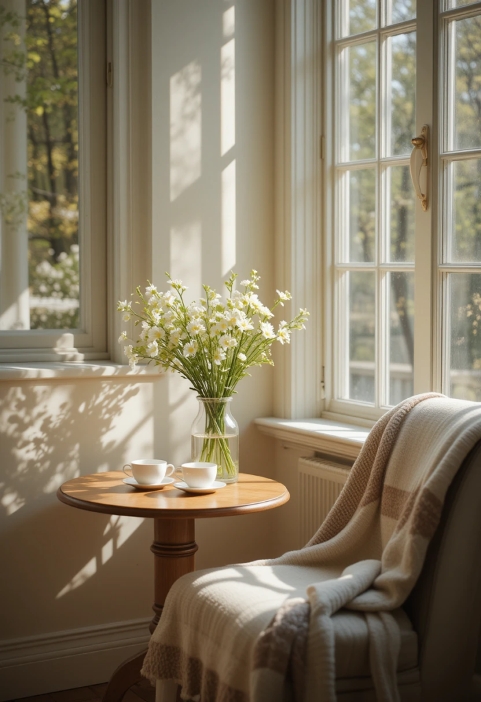 Warm lighting – Soft fairy lights or a small table lamp can add a cozy glow for evening tea sessions.