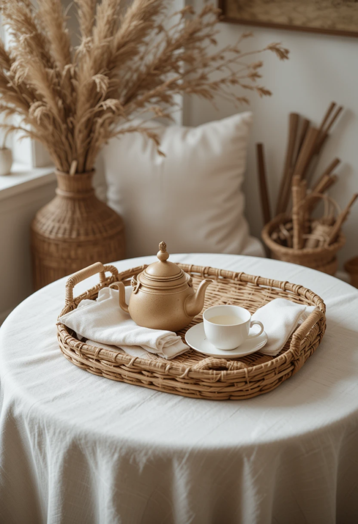 Natural textures – Use wooden trays, woven baskets, or linen tablecloths to create a cozy, organic feel.